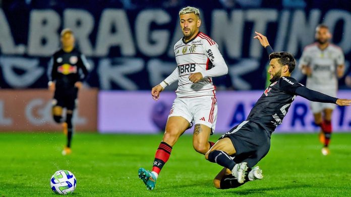 Resposta com Arrascaeta. O Flamengo assustou, de fato, o gol do Bragantino aos dez minutos. Wesley recebeu na ponta direita e tocou na direção de Pedro, que deixou a bola passar para Arrascaeta. O uruguaio chutou com categoria, mas a bola tocou na trave de Lucão antes de sair das quatro linhas.